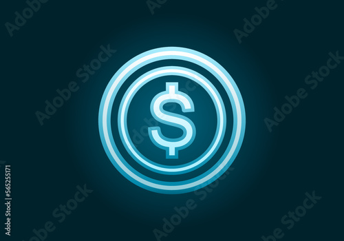 Blue dollar coin money financial neon light glowing on dark blue background icon vector design.