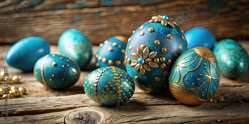 Blue easter eggs with gold inlay and gemstones on rustic background, blue, easter eggs, gold, gemstones, decorations