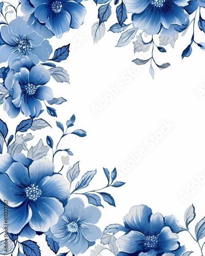 Blue floral background along the border with room for copy. Ai generative Art.