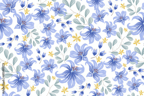 Blue flower pattern seamless embroidery ikat oriental batik watercolour design background border wallpaper. Floral motifs seamless pattern Vector illustration