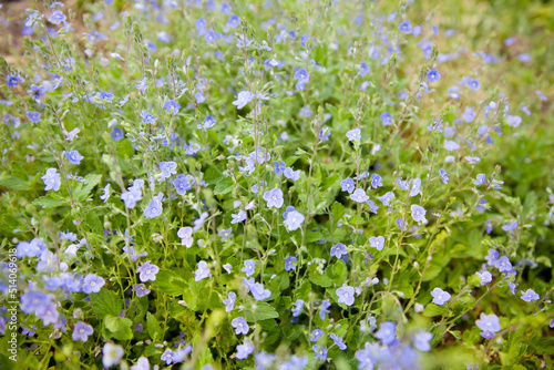 Blue forget me not flowers blooming on green background (Forget-me-nots, Myosotis sylvatica, Myosotis scorpioides). Spring blossom background. Closeup,