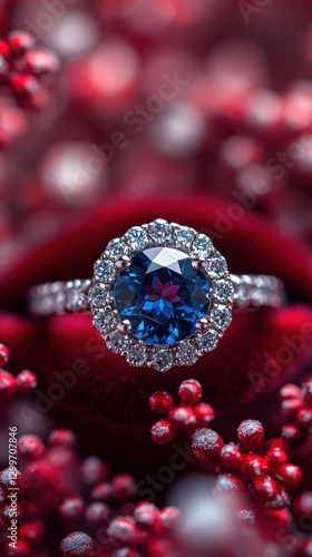 ring, gemstone, jewellery, engagement, blue, diamond, red, velvet, gift, box, holiday, christmas, christmas gift, luxury, elegant, precious, special, occasion, beautiful, woman, romantic, love, present, couple, proposal, engagement ring, sapphire, closeup, macro, detail, sparkling, sharpened, shiny, close, gift box, red velvet, gem, high-quality, spark, detail, honed, celebration