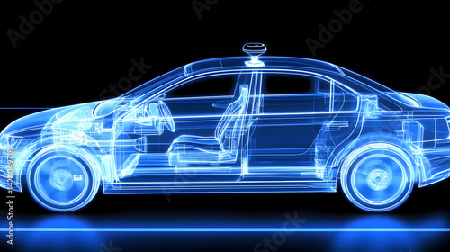 Blue glowing car schematic, side view, dark background, technology concept, ideal for automotive websites