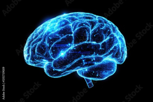 Blue Glowing Digital Human Brain Illustration on Black Background. Technology, AI, and Neural Network Concept.