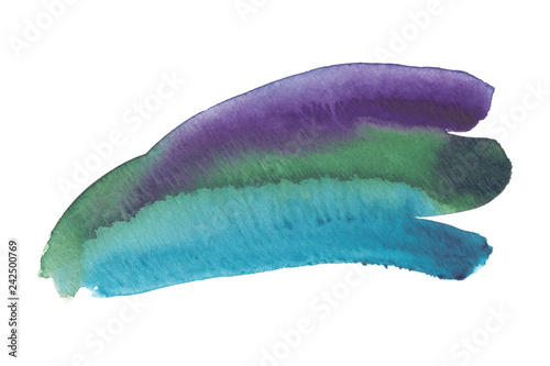 Blue, green and purple brush strokes painted in watercolor on clean white background