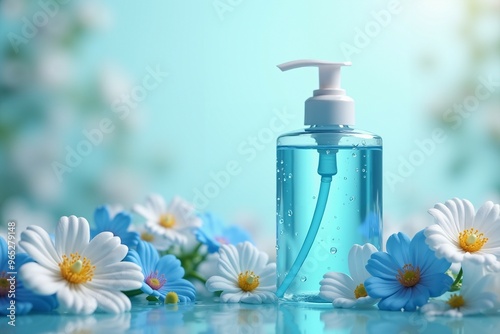 bottle, blue, flower, white flower, blue flower, floral, clean, hygiene, health, safety, antibacterial, disinfectant, liquid, pump, dispenser, fresh, spring, summer, background, blue background, light blue, teal, pastel, beauty