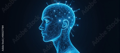 Blue hologram depicts AI as a human head within futuristic glow network structure Digital Wireframe