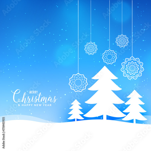 blue merry christmas landscape background with paper style tree and balls