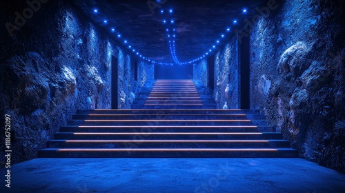 stair, step, underground, passage, tunnel, blue, neon, light, illuminated, dark, mystery, architecture, interior, design, modern, futuristic, abstract, subterranean, descent, ascent, pathway, corridor, hallway, stone, rock, wall, textured, glowing, light, illumination, atmosphere, ambience, night, deep, dramatic, perspective, depth, cold, blueish
