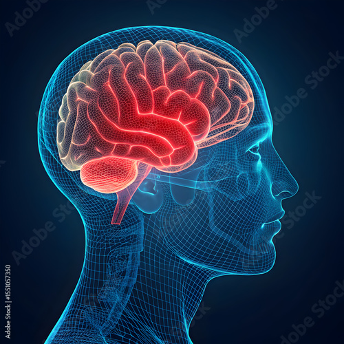 Blue neon wireframe of a human brain, glowing red from the center, showcasing a futuristic and high-tech design with illuminated neural pathways.