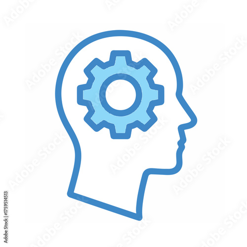 Blue outline of a human head with a gear inside representing thought process