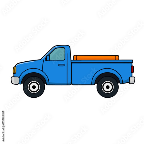 Blue pickup truck with orange bed liner isolated on white background