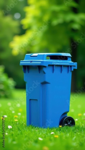 Blue recycling bin sits on vibrant green lawn , container, park, metal