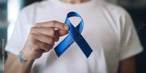Blue Ribbon Held by a Person, Symbolizing Cancer Awareness, Affixed to Their White T-Shirt, Captured in a Blurred Office Environment, Emphasizing Health and Unity in the Fight Against Cancer