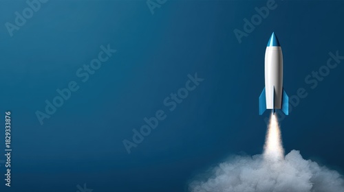 Blue Rocket Launching into Sky with Smoke Trail on Minimalist Background
