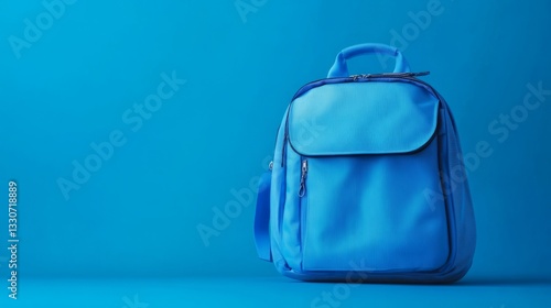 Blue school bag on light background with minimalist composition, featuring a classic backpack design with multiple compartments and zippers, ideal for back-to-school themes, education concepts, and st