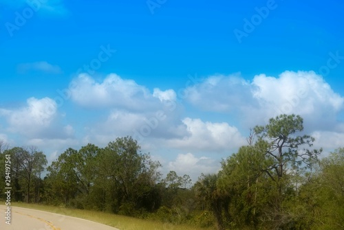 sky, landscape, nature, tree, field, blue, grass, summer, cloud, green, cloud, forest, meadow, rural, road, country, tree, countryside, horizon, outdoors, white, scenery, view, sunny, cloudy