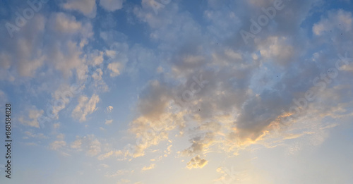 Blue sky clouds background. Beautiful weather landscape with cloud and orange sun light on horizon