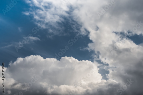 Blue sky with puffy clouds for background. Atmospheric phenomena in formation of precipitation.