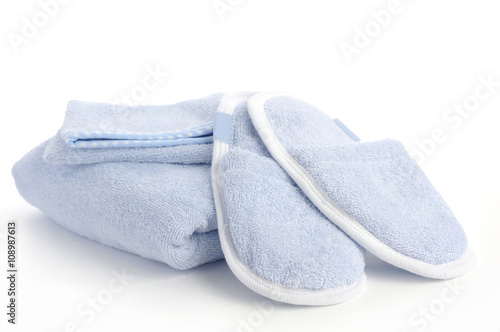 blue slippers, towel and bath & shower mitt isolated on white