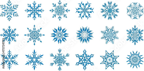 Blue Snowflakes Set, Winter Elements, White Background, Festive Decoration, Cold Icon
