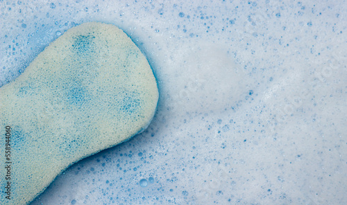 Blue sponge for bathing on soapy foam on the water on a blue background with copy space. Foam texture as background for image