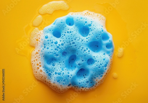 Blue sponge with bubbles on a vibrant yellow background, creating a playful and cheerful atmosphere Ideal for cleaning and household concepts, appealing to a wide audience