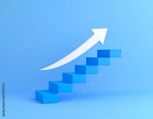 step, upward, growth, success, progress, blue, white, arrow, achievement, motivation, future, goal, reaching, climbing, advancement, positive, strategy, minimalist, three-dimensional, modern, geometric, pastel, simple, illustration, design, concept, path