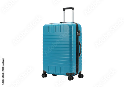 Blue suitcase with wheels and retractable handle isolated on transparent background