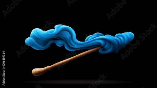 Blue Swirl on Wooden Stick: A captivating abstract image features a vibrant blue swirl of liquid or paint cascading gracefully from a wooden stick against a stark black backdrop.