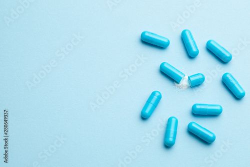 Blue tablets in capsules. One capsule is open. Blue background. Copy space for text.