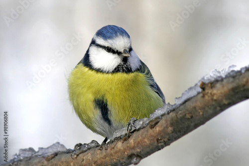 blue tit sitting in the Park on a branch covered with ice