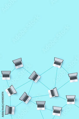 Blue vertical background with computers connected to the global network. The concept is global communications, globalization and unification. User interaction within local and global networks.
