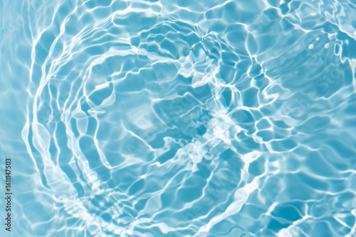 Blue water with ripples on the surface. Defocus blurred transparent blue colored clear calm water surface texture with splashes and bubbles. Water waves with shining pattern texture background.