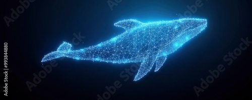 Blue whale figure with glowing polygon structure on dark background, digital art concept