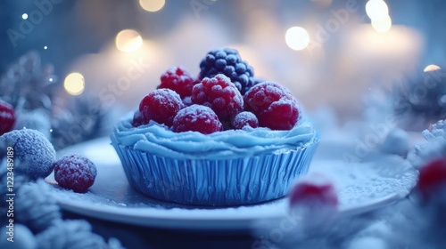 cupcake, berry, raspberry, blackberry, winter, christmas, festive, dessert, sweet, blue, food, pastry, cake, sugar, icing, frosting, snow, cold, glacé, delicious, holiday, celebration, treat, confectionery, winter landscape, cosy, magical, bokeh, light