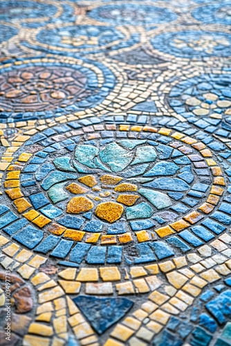 blue yellow and brown mosaic tile floor pattern design close up texture background