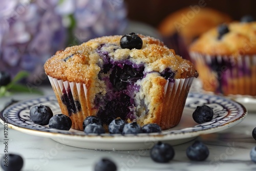 baked goods, pastry, dessert, breakfast, homemade, bakery, closeup, food photography, delicious, muffin, blueberry, snack, plate, cake, baking, epicure, hydratation, confectionery, purple flower, healthy snack, comfort food, brunch, natural light