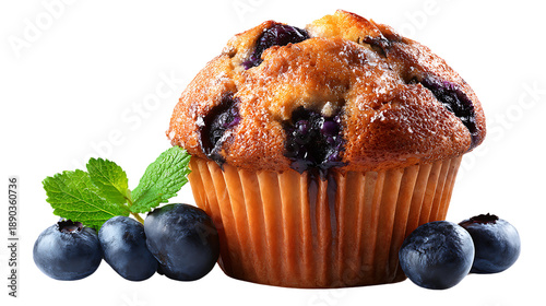 Blueberry muffin with fresh blueberries and mint leaves isolated on transparent background
