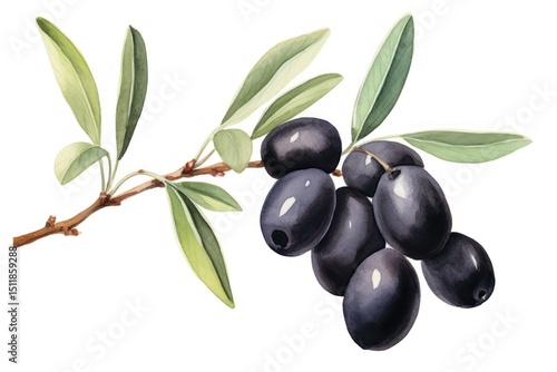 food and drink, illustration, black olive, huckleberry, studio shot, watercolor, background, still life, watercolor, blueberry, freshness, realistic, closeup, isolated, produce, tree branch, berry, black, fruit, olive, paint, plant, solid, food, leaf, pear, plum, tree