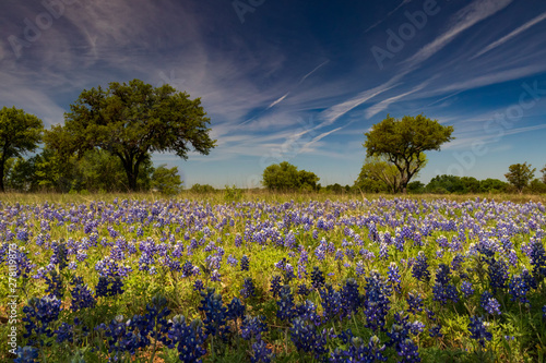 Bluebonnets wildflowers under large trees in field and blue sky background