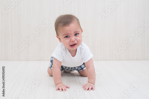 Blue-eyed baby boy on white wooden background