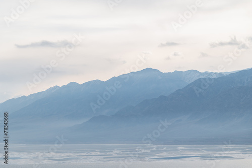 Bluish silhouettes of misty mountains and a panorama of the lake. Beautiful mountain landscape. Orto-Tokoy reservoir in Kyrgyzstan in winter.