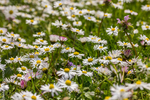 Blumenwiese im Frühling mit vielen Gänseblümchen