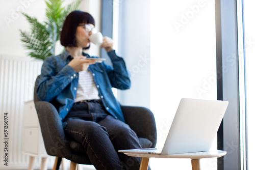Blur background of female office worker drinking coffee and looking at panoramic window while sitting in comfy armchair. Focus on portable laptop standing on small table near.