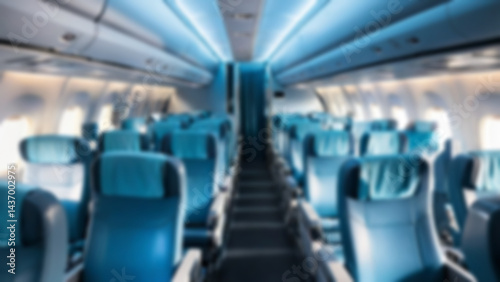 blurred airplane seats, interior inside a passenger plane, economy class, with blurred airplane seats background