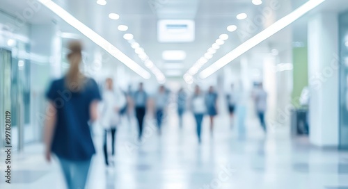 Blurred background of a modern hospital interior with people walking in the hall, a white color tone, blurred bokeh lights, blurred background of an office space