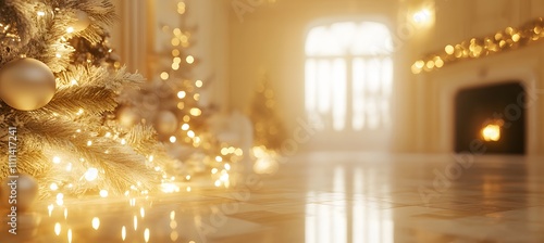 Blurred background of an elegant Christmas room with garlands and trees, blurred bokeh lights, light yellow and white colors, free space for text, cozy atmosphere,