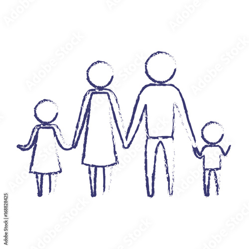 blurred blue silhouette of pictogram parents with a girl and little boy holding hands vector illustration