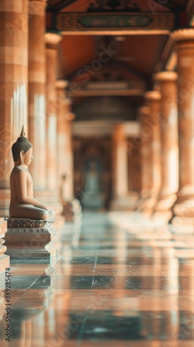 Blurred Buddhist temple interior with no people, classical interior, light colors, background, wallpaper